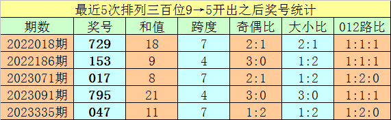 1、排列三最近两期百位号码分别开出9和5,历史上百位号码连续两期分别开出9和5的奖号出现了78期。前五期开出之后其下期奖号分别为:729、153、017、795、047;