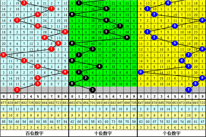 大中小分析:在组选0-9号码分布图中,前10期小号(0-2区段)出现10枚奖号,中号(3-6区段)出现10枚奖号,大号(7-9区段)出现10枚奖号,上期大中小区间分别出现1枚奖号,本期预计大中小区域各出1枚奖号。