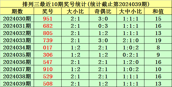 上期回顾:排列三第2024039期奖号为:508。奖号类型:组六,和值:13,奇偶比:1:2,跨度:8,大小比:2:1。