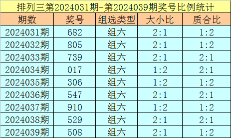 上期回顾:排列三第2024039奖号开出508,奖号质合比为1:2,大小比为2:1,跨度为8,类型为组六。