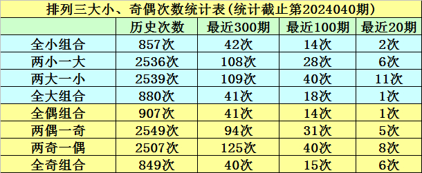 连续10期奖号中,全小形态开出0期,两小一大形态开出4期,两大一小形态开出6期,全大形态开出0期,本期大小形态判断:两大一小奖号。