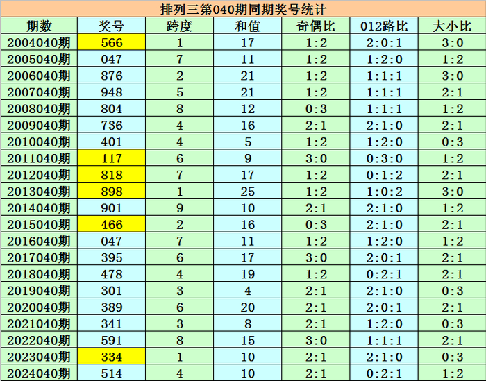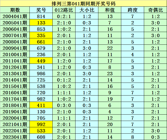 本期为排列三第2024041期开奖,开奖日期为:2024年2月20日,历史上排列三第041期已开出了20次奖号,历年同期开出号码分别为:814-133-853-335-661-679-236-449-341-986-725-538-720-982-411-130-705-992-533-608。