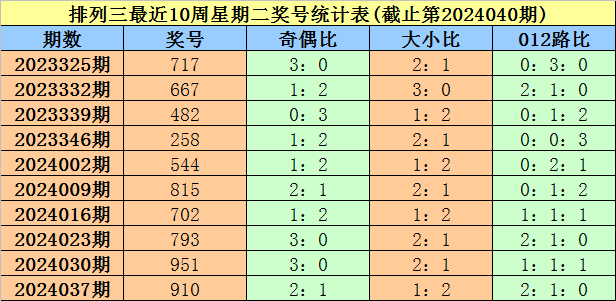 上期回顾:排列三第2024040期奖号为514。其中奖号奇偶比为2:1,大小比为1:2,012路比为0:2:1。