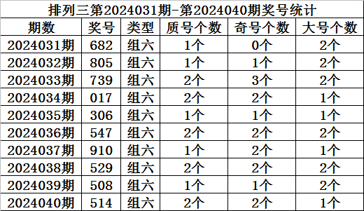 上期回顾:排列三第2024040期开奖:514,质合比为2:1,奇偶比为1:2,大小比为2:1。