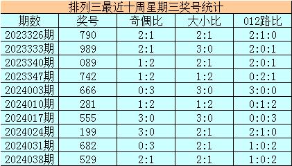 排列三十周星期三分别开出奖号:529、682、199、555、281、666、742、089、989、790,其中号码奇偶比为15:15,奇偶号码基本持平;号码大小比为21:9,小号走势较冷;号码012路比为13:5:12,1路号码走冷。