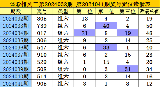 开奖回顾:排列三第2024041期奖号为:905,各位号码遗漏值分别为3、1、8,遗漏总值为12。