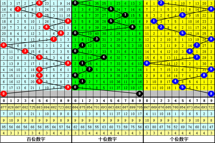 十位:上期为0,近10期012路比为5:4:1,其中0路号遗漏1期出现,本期注意0路号再出,参考9。