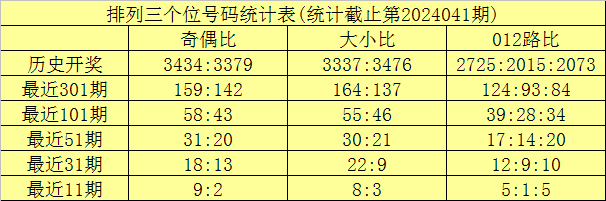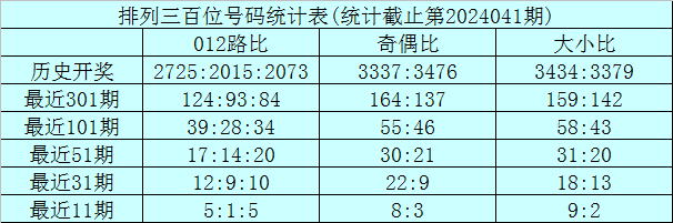 上期回顾:排列三第2024041期奖号为:905。奖号形态组六,大小比2:1,奇偶比2:1,012路2:0:1。