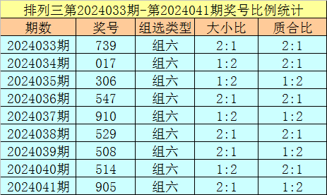 上期回顾:排列三第2024041奖号开出905,奖号质合比为1:2,大小比为2:1,跨度为9,类型为组六。