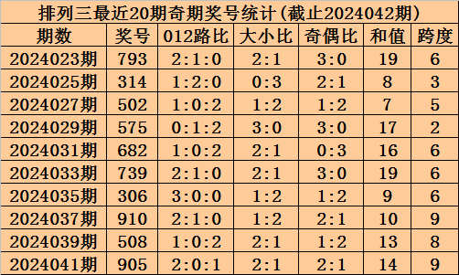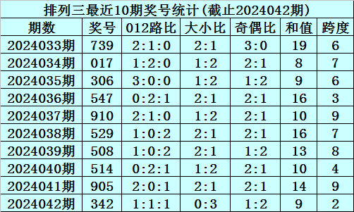 上期回顾:排列三2024042期奖号为342,奇偶比为1:2,大小比为0:3,跨度为9。