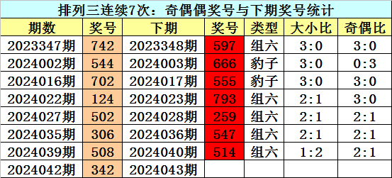 上期回顾:排列三2024042期奖号为:342。类型:组六,奇偶:奇偶偶,大小:小小小。