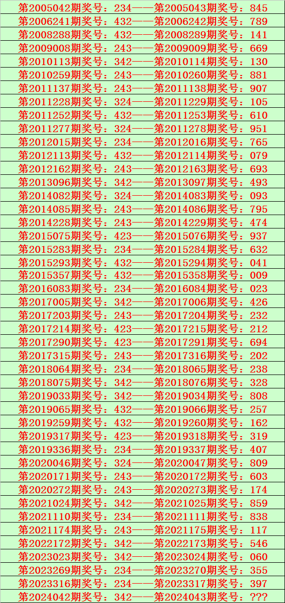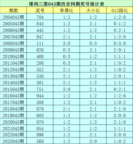 排列三第2024043期开奖日期:2024年2月22日,历史上第043期已开出了20次奖号,历年同期号码分别为:704、845、445、947、111、626、408、286、352、530、501、751、944、508、079、603、070、054、096、568。