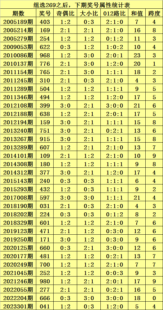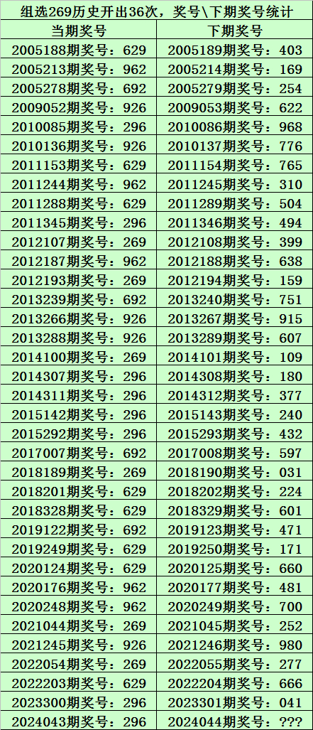 二、组选269分析:排列三历史上已开出36次组选号码269了,其奖号和下期开出奖号统计如下: