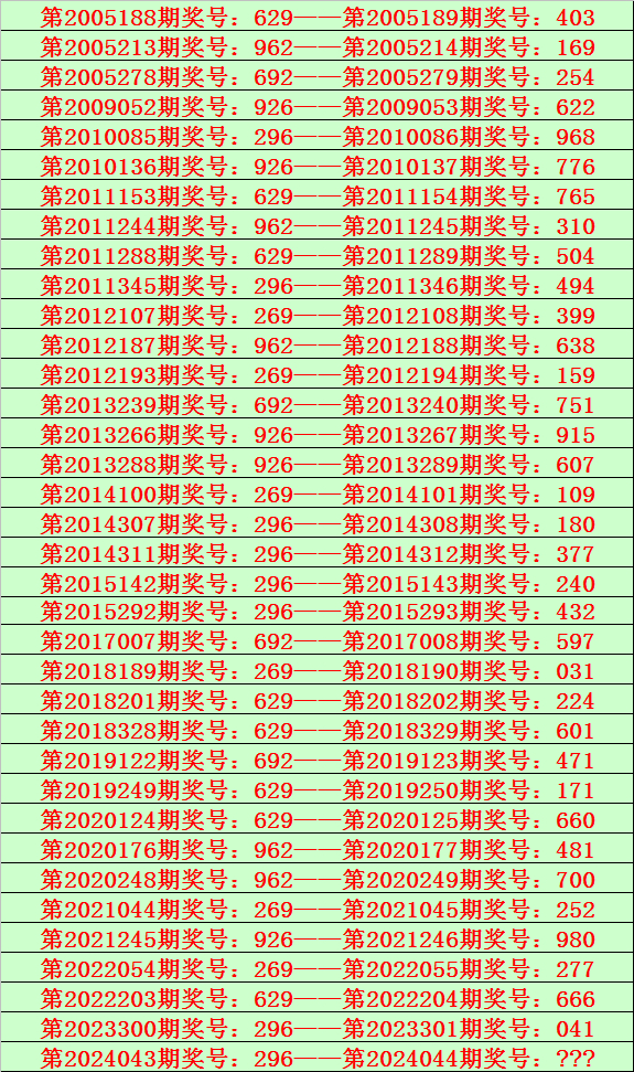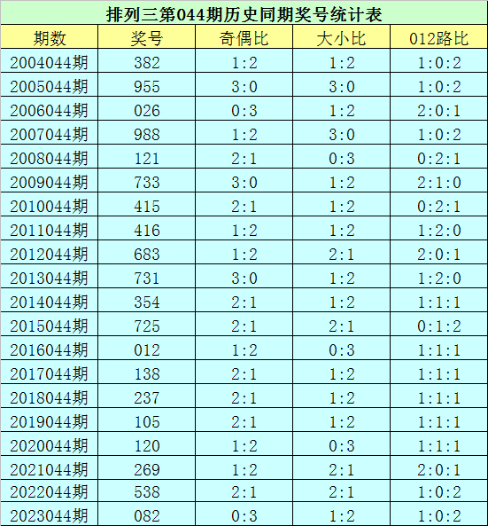 排列三第2024044期开奖日期:2024年2月23日,历史上第044期已开出了20次奖号,历年同期号码分别为:382、955、026、988、121、733、415、416、683、731、354、725、012、138、237、105、120、269、538、082。
