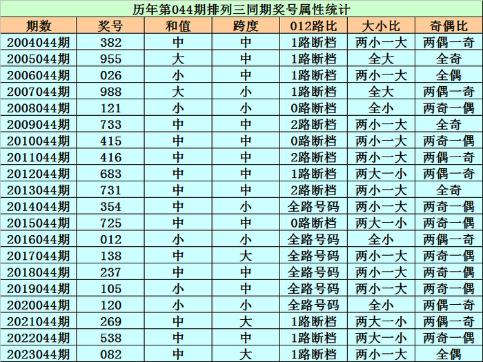 历史上第2024044期排列三已开出20期奖号了,历年同期奖号分别为:382、955、026、988、121、733、415、416、683、731、354、725、012、138、237、105、120、269、538、082,详细统计见下表:
