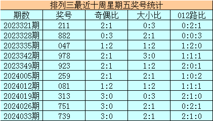 排列三十周星期五分别开出奖号:739、751、313、081、259、923、978、047、882、211,其中号码奇偶比为19:11,偶数开出较少;号码大小比为14:16,大小号码基本持平;号码012路比为10:10:10,基本持平。