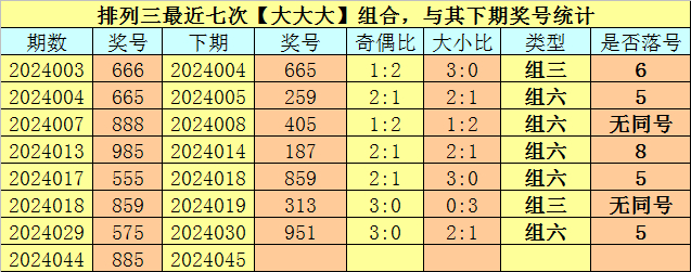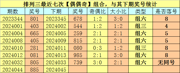 开奖回顾:排列三第2024044期开奖号码为:885。奖号类型为:组三,大小类型为:大大大,奇偶类型为:偶偶奇,无重号。