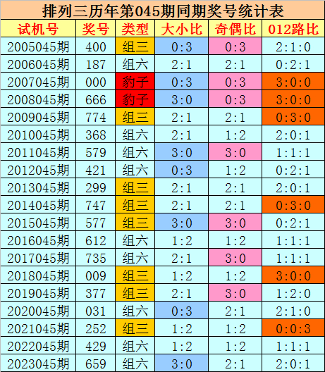 奇偶分析:历史上排列三第045期同期奖号中,奇偶比0:3出现3期,奇偶比3:0出现4期,奇偶比1:2、2:1出现6期,奇偶奖号总比例开出30:27,奇数号码相对活跃,今年第045期预计奇数号码再次走热,关注奇偶比为2:1。