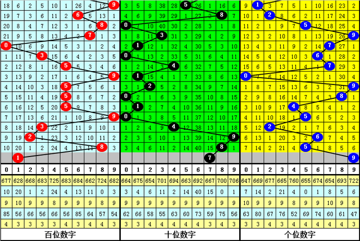 大中小分析:在组选0-9号码分布图中,前10期小号(0-2区段)出现9枚奖号,中号(3-6区段)出现13枚奖号,大号(7-9区段)出现8枚奖号,上期0小号区域断区,本期看好中号码走冷,注意3-6区段不落号。