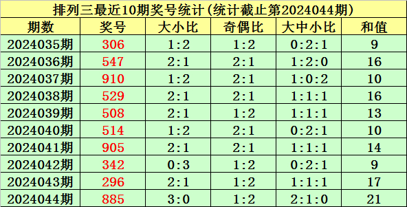上期回顾:排列三第2024044期奖号为:885。奖号类型:组三,和值:21,奇偶比:1:2,跨度:3,大小比:3:0。