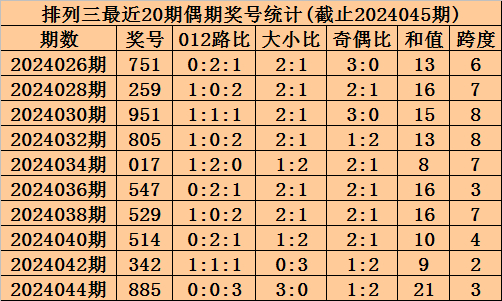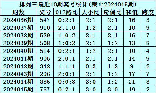 上期回顾:排列三2024045期奖号为757,奇偶比为3:0,大小比为3:0,跨度为19。