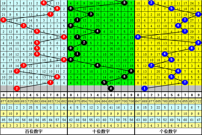大中小分析:在组选0-9号码分布图中,前10期小号(0-2区段)出现8枚奖号,中号(3-6区段)出现12枚奖号,大号(7-9区段)出现10枚奖号,上期0小号区域断区,本期防大号转冷,预计7-9区段无号。