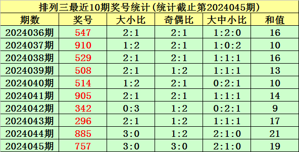 上期回顾:排列三第2024045期奖号为:757。奖号类型:组三,和值:19,奇偶比:3:0,跨度:2,大小比:3:0。