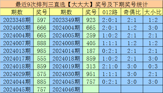 上期回顾:排列三第2024045期奖号为757,组三,大小比开出3:0,直选分布为:大大大。
