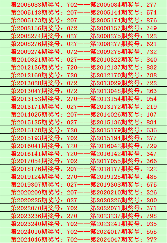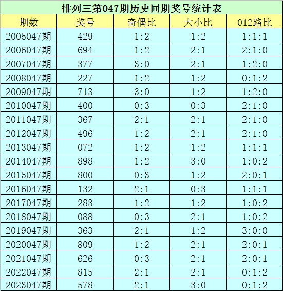排列三第2024047期开奖日期:2024年2月26日,历史上第047期已开出了19次奖号,历年同期号码分别为:429、694、377、227、713、400、367、496、072、898、800、132、283、088、363、809、626、815、578。
