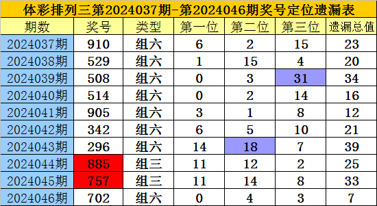 开奖回顾:排列三第2024046期奖号为:702,各位号码遗漏值分别为0、4、3,遗漏总值为7。