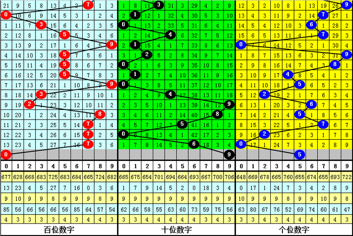 首位跨度分析:首位号码最近3期奖号为7-7-7,连续两期跨度为0、0,历史上首位号码连续两期分别开出跨度0、0的现象共出现63次,其前两次开出奖号分别为: