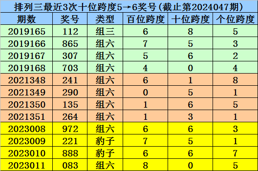 中位跨度分析:最近3期中位分别开出奖号5-0-6,最近两期跨度分别开出5、6,中位号码历史上连续两期跨度开出5、6的奖号共开出49次,其前两次奖号开出:
