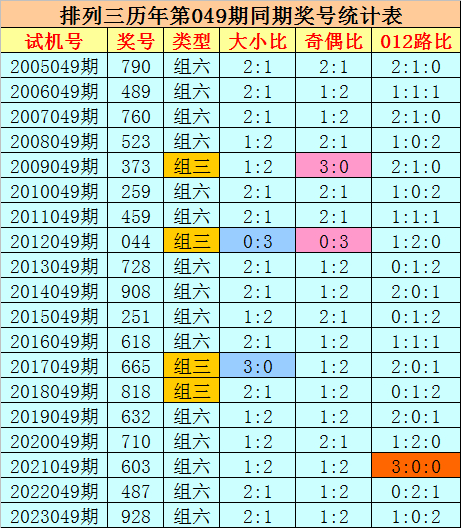 012路分析:历史上排列三第049期同期奖号中,012路奖号总个数比为23:15:19,012路奖号轮空期数比为4:7:6,今年第049期预计012路号码平衡出现,关注012路比1:1:1。