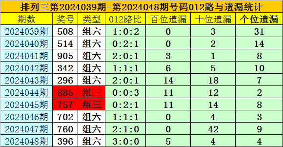 开奖回顾:排列三第2024048期奖号为:396,类型为组六,号码012路比为3:0:0,百十个位号码直选分别遗漏5期、4期和4期。