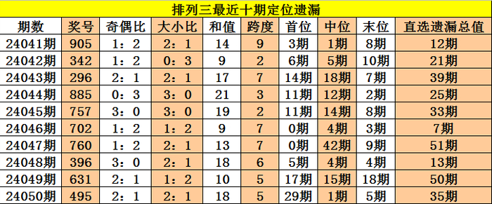 开奖回顾:排列三第2024050期奖号:495,定位直选遗漏值29期、1期、5期,遗漏总值为35期。