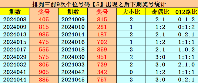 个位号码:上期奖号为大号、奇数、2路号码:5,历史上个位号码5共开出656期,前一次出现在第2024044期,上期遗漏5期再出。
