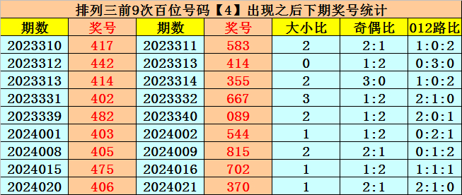 在百位前9次出现号码4之后,下期百位分别开出奖号:5-4-3-6-0-5-8-7-3,其中开出号码个数大小比是5:4,012路比是4:2:3,奇偶比是5:4。