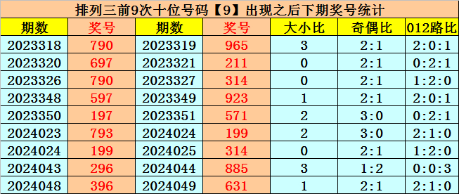 在十位前9次出现号码9后,其下期奖号分别开出:6-1-1-2-7-9-1-8-3,其中奖号个数012路比是3:4:2,奇偶比是6:3,大小比是4:5。