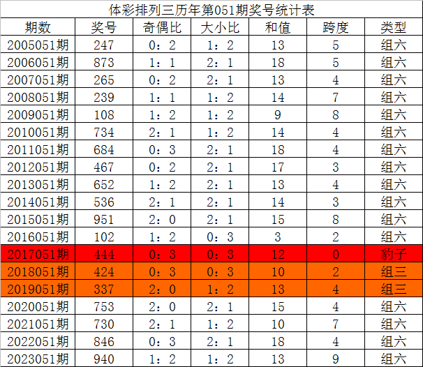 体彩排列三历年第051期开出奖号分别为:247、873、265、239、108、734、684、467、652、536、951、102、444、424、337、753、730、846、940。统计详见下表: