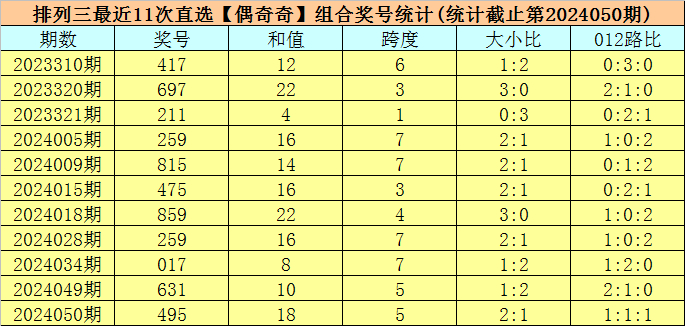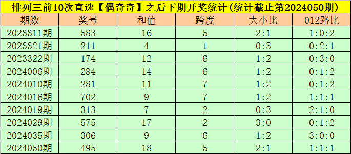 开奖回顾:排列三第2024050期开出奖号:495,类型为组六,和值为18,奇偶比为2:1,大小比为2:1,跨度为5。