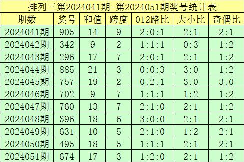 开奖回顾:排列三第2024051期奖号开出:674,组选类型:组六,大小比为2:1,奇偶比为1:2,和值为17,跨度为3。