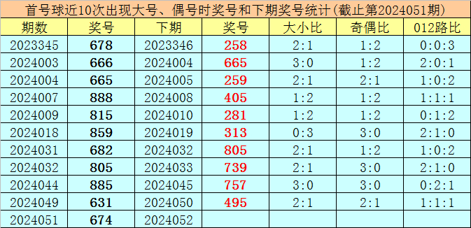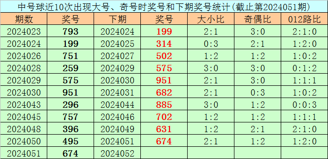在中号球前10次开出大号、奇号类型之后,其下期分别开出奖号:199、314、502、575、951、682、885、702、631、674,其中号码大小比为6:4,012路比为4:3:3,奇偶比为6:4。