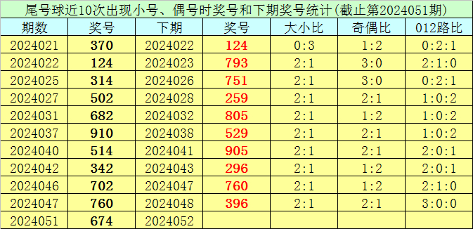 尾号球:上期奖号为4,开出小号、偶号,该位前10次开出小号、偶号的现象时其奖号分别为:370、124、314、502、682、910、514、342、702、760,其中尾号球012路比为3:3:4。