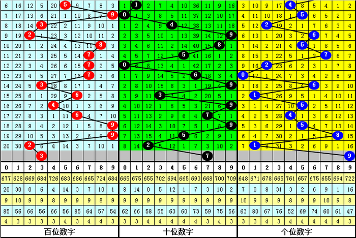 大中小分析:在组选0-9号码分布图中,前10期小号(0-2区段)出现7枚奖号,中号(3-6区段)出现12枚奖号,大号(7-9区段)出现11枚奖号,上期奖号全在小号区域,本期注意小号走冷,防0-2区段断区。