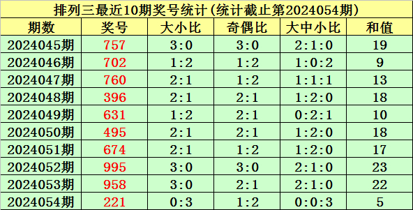 上期回顾:排列三第2024054期奖号为:221。奖号类型:组三,和值:5,奇偶比:1:2,跨度:1,大小比:0:3。