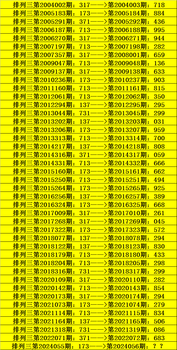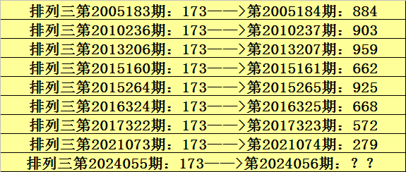 第2024055期排列三奖号为173,历史上该号码直选出现9次,下期奖号分别为:884、903、959、662、925、668、572、279。