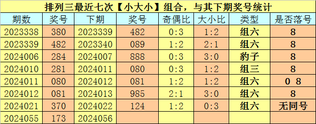 大小分析:排列三上期开出号码173,大小类型为【小大小】,最近七次开出大小类型小大小的奖号分别为:380、482、284、281、080、081、370,其下期分别开出号码:482、089、888、080、081、985、124。其中号码大小比为11:10,大小号码出现次数基本相当,本期注意大号转热,看好出现2个大号。