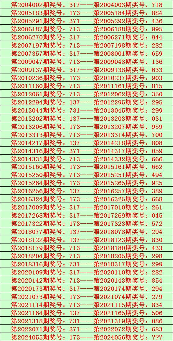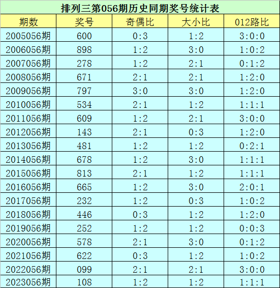 排列三第2024056期开奖日期:2024年3月6日,历史上第056期已开出了19次奖号,历年同期号码分别为:600、898、278、671、797、534、609、143、481、678、813、665、232、446、252、578、622、099、108。