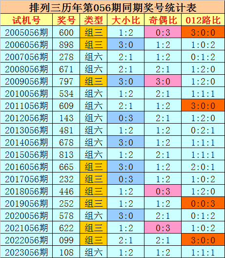 012路分析:历史上排列三第056期同期奖号中,012路奖号总个数比为22:16:19,012路奖号轮空期数比为4:8:7,今年第056期预计0路号码走冷轮空,看好012路比开出0:1:2。