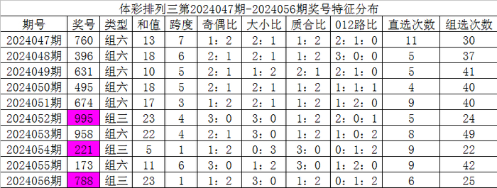 开奖公告:体彩排列三第2024056期开出奖号:788。组三,有重号:7,奇偶比1:2,大小比3:0,012比0:1:2,和值23,跨度1。